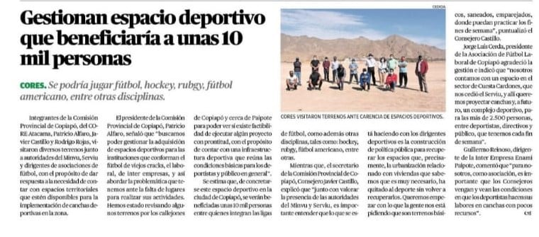 el 16 Oct 2020 por Roberto Soto Rojas (Editor) Entrevistas Gestionan espacios deportivo que beneficiaran a unas 10 mil personas.