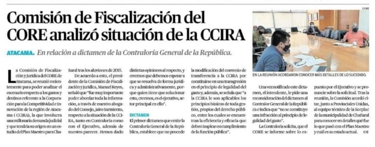 el 18 Nov 2020 por Roberto Soto Rojas (Editor) Entrevistas Comisión de Fiscalización del Core analizo situación de la CCIRA