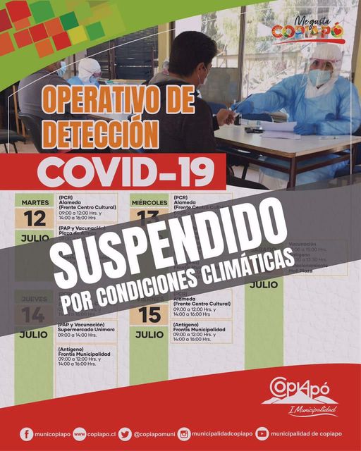 el 15 Jul 2022 por Roberto Soto Rojas (Editor) Entrevistas Los operativos de detección de #COVID19 en Copiapó se suspende hoy por condiciones climáticas.