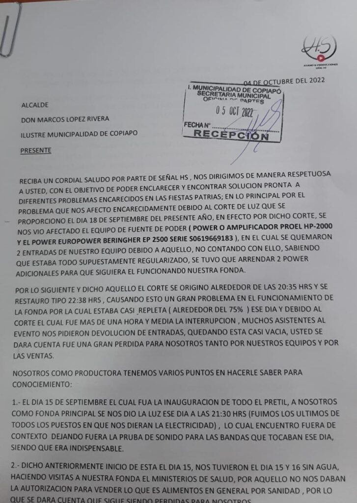 el 16 Dic 2022 por Roberto Soto Rojas (Editor) Entrevistas Encargado de las Ramada HS ingresó su carta de reclamo por 2 dias sin agua Potable para la cocineria y por corte de Luz que ocaciono daños con 2 Fuente de Poderes en pleno acto Banda Tocando con fecha 05 de Octubre en la Municipalidad a nombre de Marco Lopéz a la Fecha no tienen respuesta .
